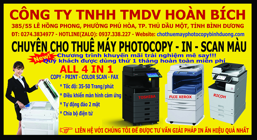 Hãy liên hệ với chúng tôi tại Công ty TNHH Thiết bị văn phòng Hoàn Bích để thuê máy photocopy tại bình dương với nhiều model máy đời mới được ưa chuộng nhất hiện nay dựa trên công nghệ phát triển theo xu hướng hiện đại cho ra bản in đẹp rõ nét nhất.